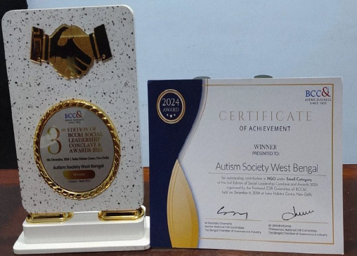 Autism Society West Bengal was the winner for outstanding contribution in NGO under Small Category at the 3rd Edition of Social Leadership Conclave & Awards, 2024 organized by National CSR Committee of Bengal Chamber of Commerce & Industries
